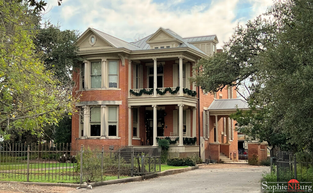 As I sit gazing out the back door of the Sophienburg museum on this gloomy December afternoon, it makes me smile as I watch the yearlings romp and play. The does graze nearby in an old pecan orchard adjacent to the Dittlinger home. The jewel of the Sophienburg Hill Historic District, it is one of my favorite scenes — worthy of being captured on canvas. I have never been inside the Dittlinger home, but I have watched it through the changing seasons from my museum window. Today, its balconies and doors are decked out in Christmas greenery. It is captivating.