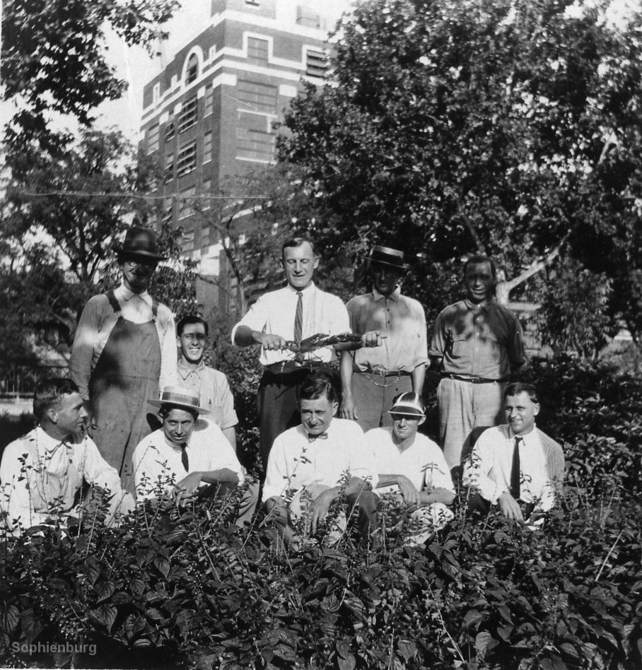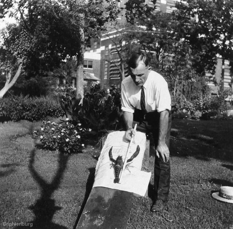 I recently found photos of Alfred Selke in the Oscar Haas collection. In August 1926, Selke and several coworkers were walking around the grounds of the new Comal Power Supply Co. (LCRA). They caught what he described as a “lobster” in the millrace pond. The group gathered for photos to chronicle the oddity including displaying the “lobster” on a cloth to show its size. Knowing it couldn’t be a lobster, I decided it must have been a great-granddaddy of a crawfish. When Charlie Nowotny came in to do his volunteer time at the Sophienburg, he saw the photo and informed me I was wrong.