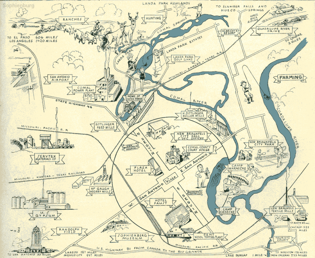 What differences from today’s city do you find? The temperature definitely is warmer. And what happened to all those ranches and farms? There are many more schools and churches. New Braunfels produced potato chips?
