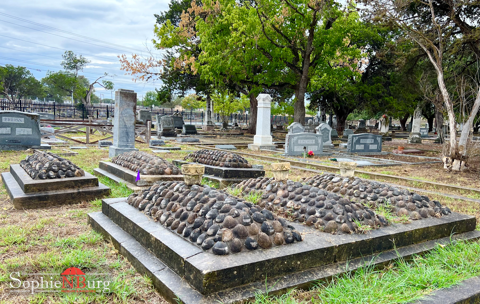 In the meantime, Mordhurst developed this technique of decorating graves. Using a wooden form to create a mound, he covered it with iron mesh, and then poured concrete into the mold. Cockleshells from the Texas coast were brought to NB by train in barrels. They were filled with cement and a wire was twisted inside before they were attached. Mordhurst died in 1928 and that was the end of the shell-covered graves.