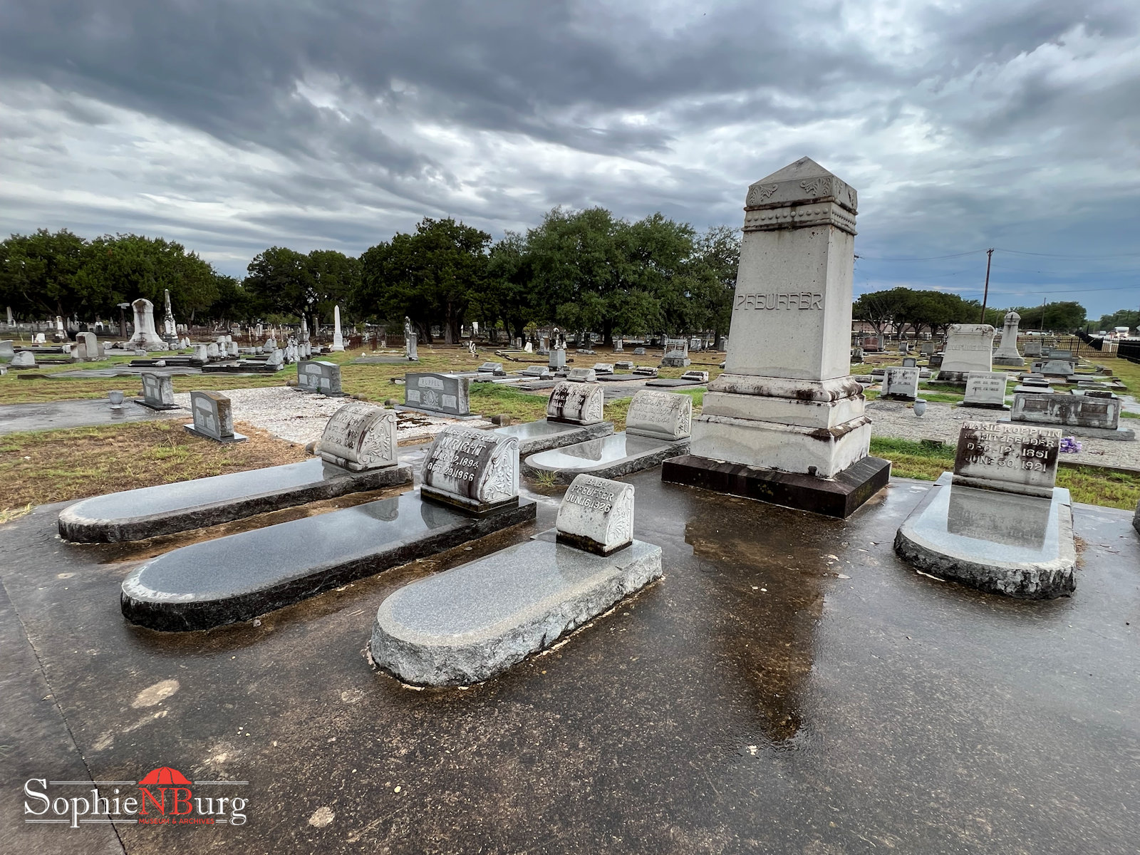 The granddaddy of obelisks in the Comal Cemetery is the one dedicated to Senator George Pfeuffer. This monument is 24 feet tall and towers over all the others. It was given in Pfeuffer’s honor by the Granite Association of Texas. Here’s the story: