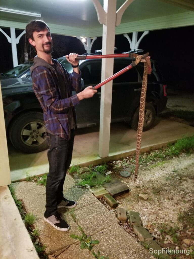 Back then, fewer people meant more places for these creatures to live. Today, with all the new building and loss of farm and pasture land, you’d think we would see a decline in the snake population. But not around my house. I know some of you like snakes and just walk around them. That’s fine. But even when I know the role they play in “the circle of life,” I’d rather not share my space with them. I live on property known as “Rattlesnake Hill” by old-timers. A couple of years ago, my mom killed over 20 rattlers one spring. This spring we have had three sightings and two exterminations….one got away into the bushes. One of the deceased had actually moved in under my back porch. For over a month we could hear the rattles go off every time we walked over the floor. Named the thing Sparkles. Sparkles scared my exterminator away…literally. Finally, my son met Sparkles on the its way out from under the house, with a .22.