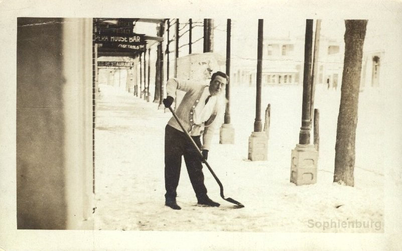 The Zeitung (German) reported snowfall even if it was in trace amounts along with weather temperatures. Like today, the town had people who sent in official amounts from different areas around the county. Rainfall amounts, in which snowfall figured, were very important in more rural early NB. Ice was reported as a separate occurrence. (There are many, many ice photos of the Plaza Fountain in the Archive’s collection.) Weather reports did not make front page news but ran in the Lokales (local news) section behind world, national and state headlines.
