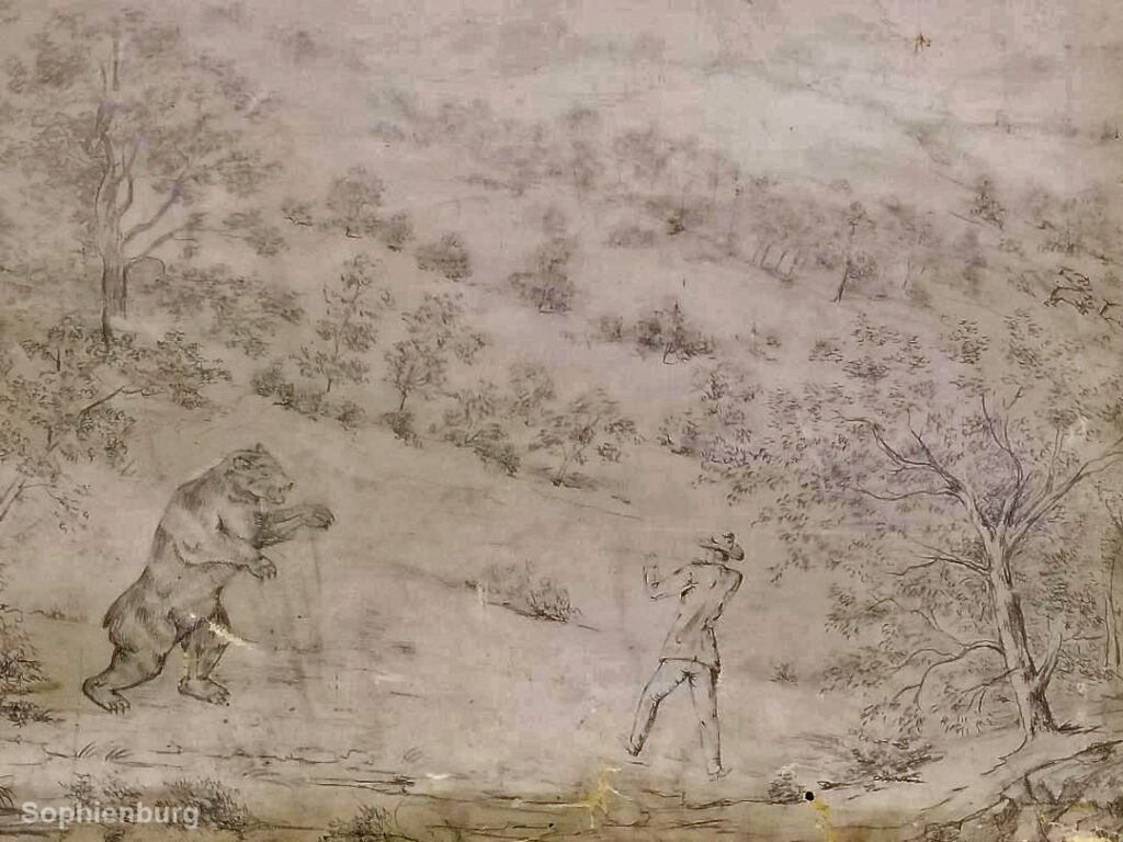 The museum’s picture, named “The Dominating Bruin”, commemorates this 1883 tale with remarkable detail and skill. It depicts a huge bear, standing on his hind legs advancing on his attacker. Otto is in front of it, bravely raising his Winchester to dispatch the massive creature. The landscape is replete with rocks and trees, hills fading away in the distance, several hogs running off to one side and a lone bird in the sky. A news article in July 1886, praises the talent of Oscar Friedrich and how amazing it was that a man, untrained in art, could show superior ability in his hunting scenes.