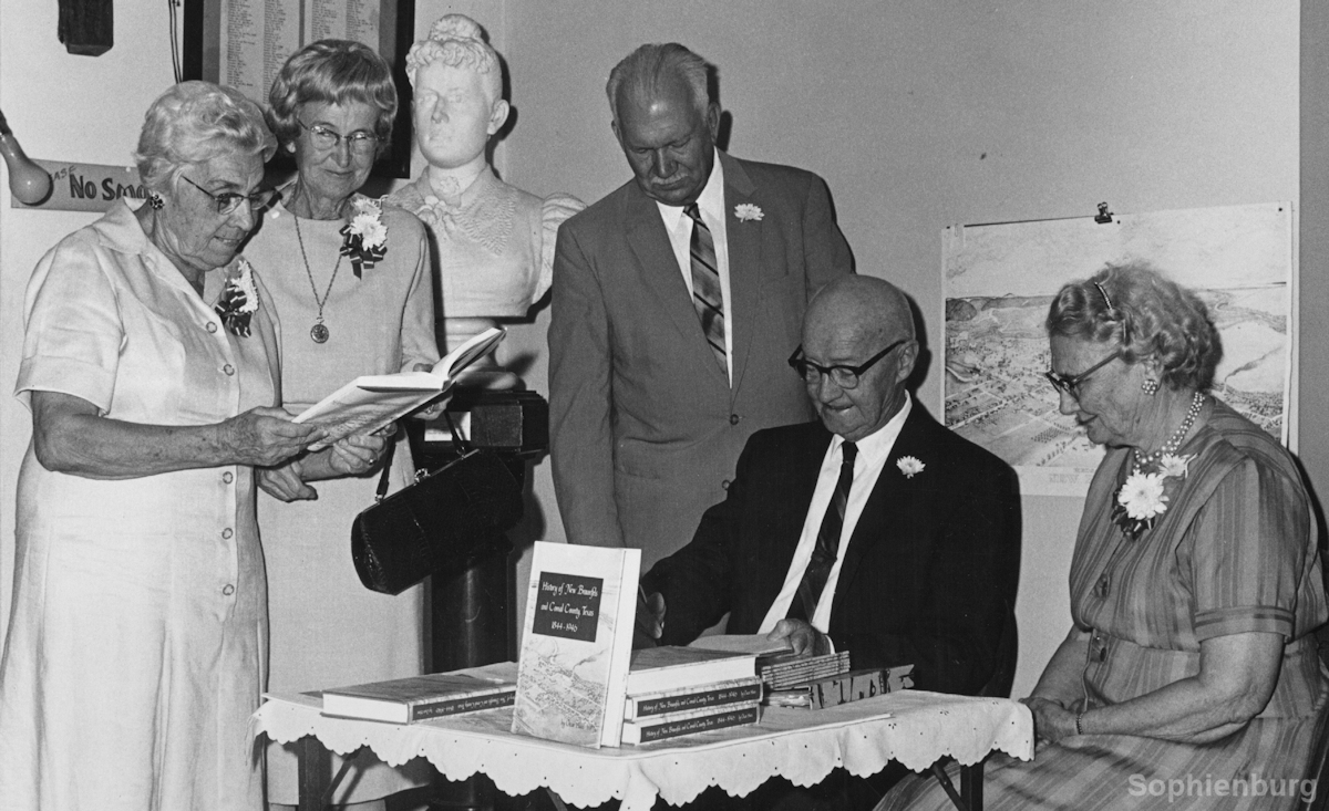 Oscar Haas was born in October of 1885, at Cranes Mill, a third- generation descendant of German colonists in Texas. His ancestors were among the 5000 immigrants landing in Indianola in the fall of 1845. He moved with his family to Blanco County and then in 1897 to New Braunfels at age 12. He attended the old New Braunfels Academy for third through sixth grade before going to work in a grocery store. He worked his way to a dry goods business partnership. In 1934, at age 49, Haas was elected Comal County treasurer. For twenty-eight years he served the county. It was during his time in the courthouse that he discovered the original Commissioners Court minutes book of 1846. His discovery immediately sparked a lifelong interest in our history and sharing it with others. He began writing articles about the details of the court minutes for the Neu Braunfelser Zeitung (German) and the New Braunfels Herald. Now remember, the minutes were in old German script. He actually copied and hand wrote the full translations of the documents on whatever scraps of paper he had – the backs of calendars, old election ballots, etc. before writing the articles. In 1944-45, he wrote the columns “99 years ago” and “100 years ago” before the city celebrated its Centennial. He continued to write articles until his retirement in 1962, when he focused his energies on writing a book, History of New Braunfels and Comal County, Texas 1844-1946. Published in 1968, it was the most comprehensive book written about the founding of New Braunfels, becoming the bible of local historians and genealogists. 2018 marks the 50th anniversary of the book. It is still in print (fourth printing) and can be found at Sophie’s Shop inside the Sophienburg Museum and Archives. Here’s to Oscar Haas, successful businessman and public servant, and most notably a “history geek” extraordenaire.
