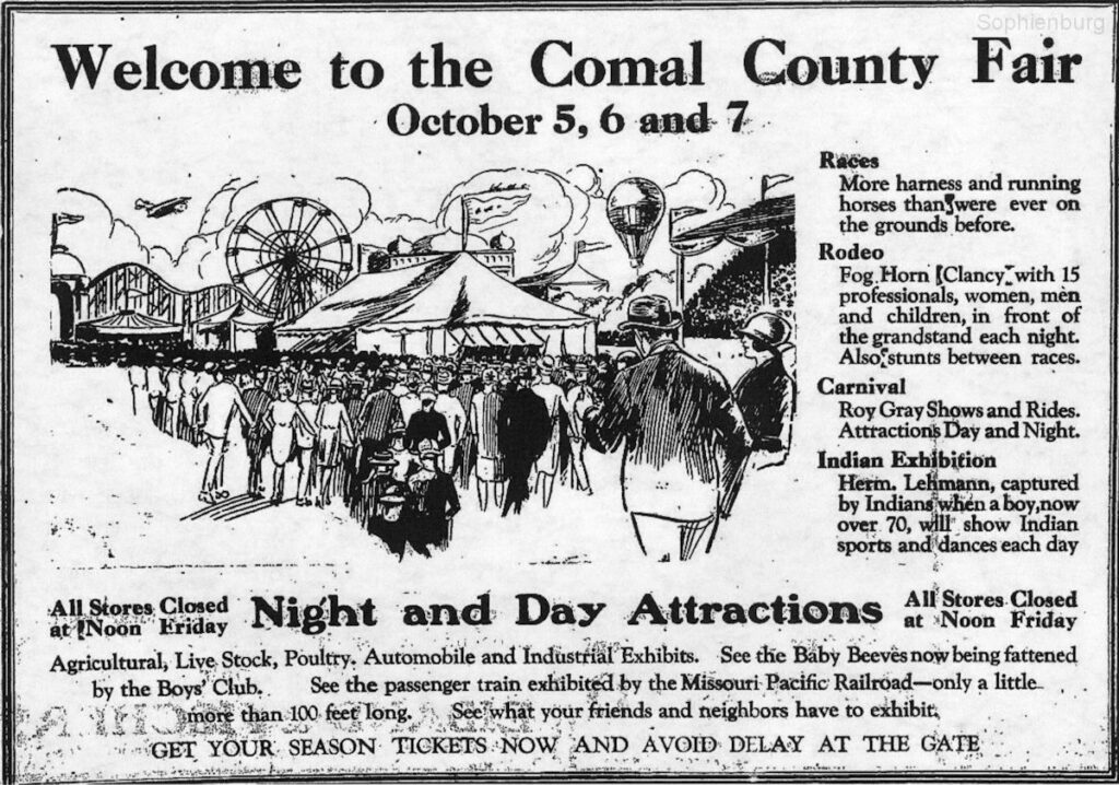 Sources: “Reflections” #292-Esther Lehmann and Gerda Lehmann Kothman, Sophienburg Museum & Archives; New Braunfels Newspaper collection – Sophienburg Museum & Archives; “Lehmann Show”, by Mike Cox – TexasEscapes.com.