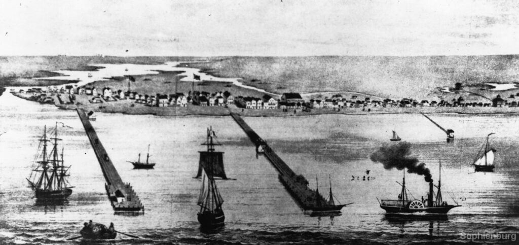 In 1844, Prince Carl of Solms-Braunfels sought a safe landing place on the Texas coast line for the colonists who would be arriving soon from Germany. He found a beach on Matagorda Bay which he named “Carlshafen” (Carl’s Harbor), after himself. Indian Point was founded short way from that beach. Because of the naturally deep harbors, Indianola, as it would come to be known, grew out of an “immigrant camp” to become a major port in Texas. Thousands of immigrants from Europe passed through the port, including those traveling to New Braunfels. Within 25 years of its founding, the town had stagecoach service, railroad service and major steamship service. Goods of all kinds, cattle, canned meats, silver bullion, even camels passed through the port. In 1875, the booming port town, with a population of nearly 6000 had a major change of luck. The Hurricane of 1875 slammed into Indianola, with winds reported at 130 miles per hour. Over 270 lives were lost and three quarters of the town was destroyed.